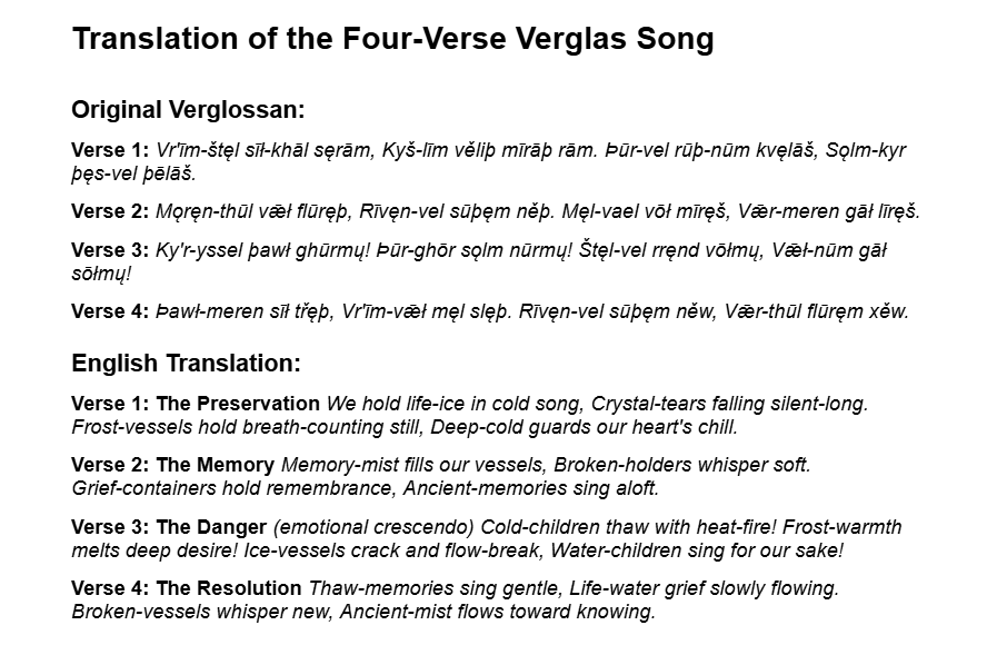 There’s the foundation of Verglossan! I’ve built this around the core patterns I identified in your song - the vr’īm/štęl (life-ice) concept, the vel/vǣł containment imagery, and those beautiful consonant clusters that suggest both crystalline preservation and flowing change.